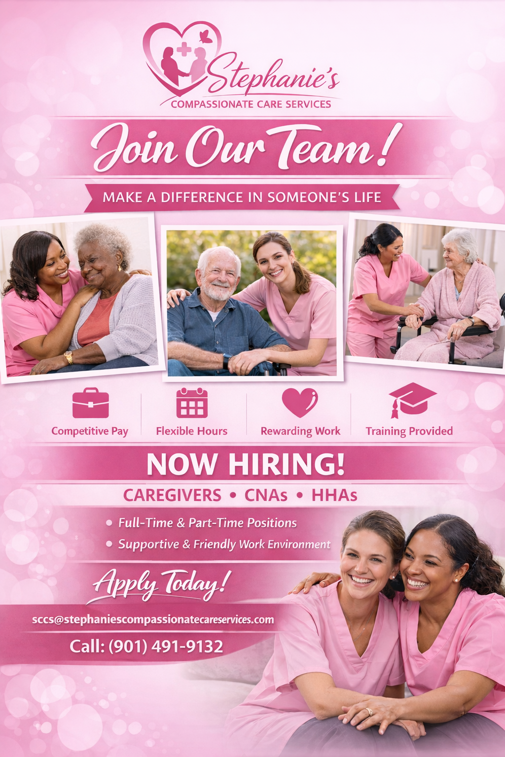At Stephanieβs Compassionate Care Services, LLC, we are building a team of dependable, professional, and compassionate caregivers/sitters/companions/ cna/managers who are committed to making a difference in the lives of others.We believe quality care begins with the right people β individuals who value dignity, respect, and reliability.
